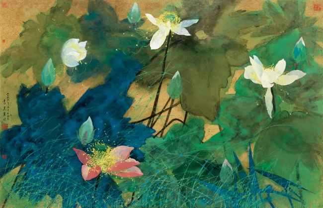 Colored ink painting on paper Hundred-year Lotus Fragrance.