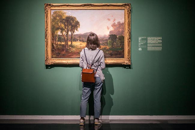 A visitor looks at a painting at the exhibition, which shows 50 landscapes and reviews the influence European masters had on US painters.