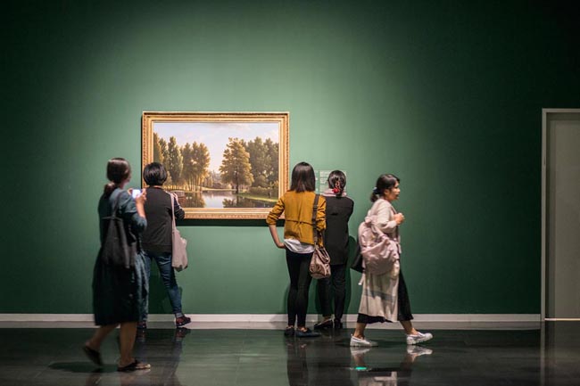 Visitors stop to look at a painting at the exhibition, which shows 50 landscapes and reviews the influence European masters had on US painters.