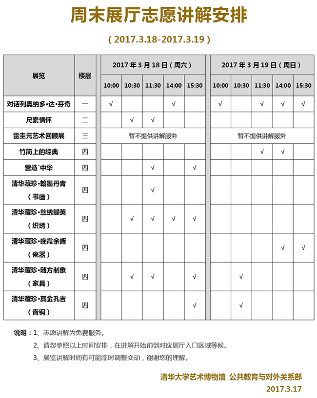 清华大学艺术博物馆 周末展厅志愿讲解安排(2017年3月18日-19日)