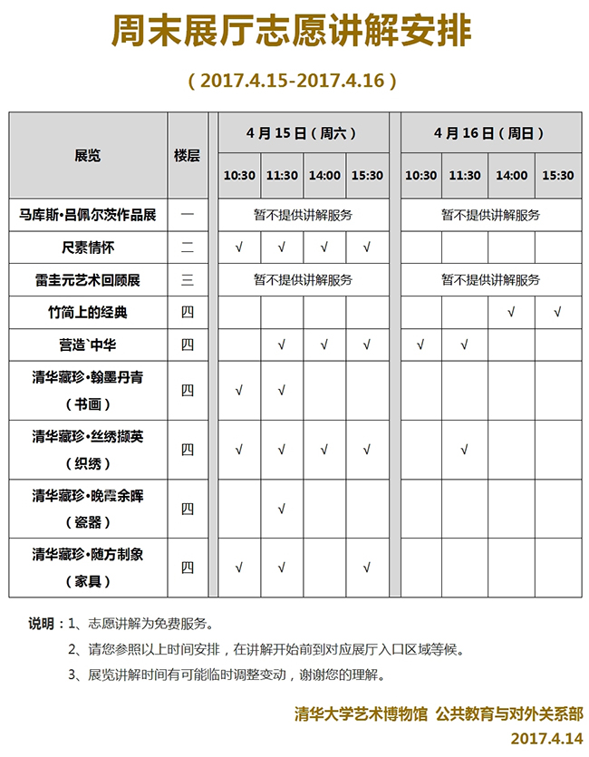 清华大学艺术博物馆 周末展厅志愿讲解安排(2017年4月15日-16日)