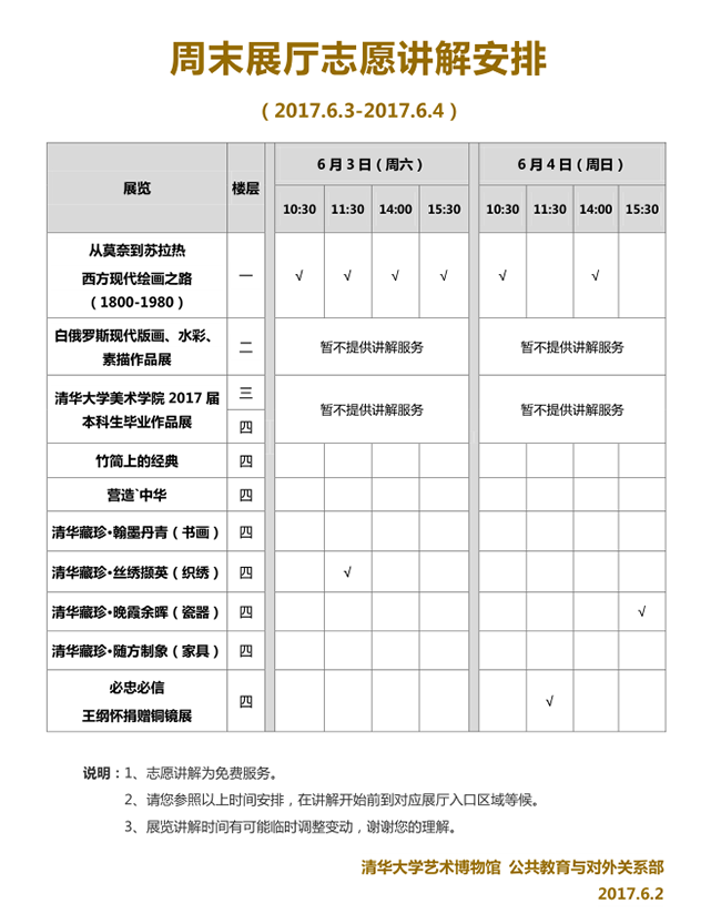 清华大学艺术博物馆 周末展厅志愿讲解安排(2017年6月3日-4日)