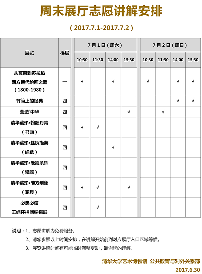 清华大学艺术博物馆 周末展厅志愿讲解安排(2017年7月1日-2日)