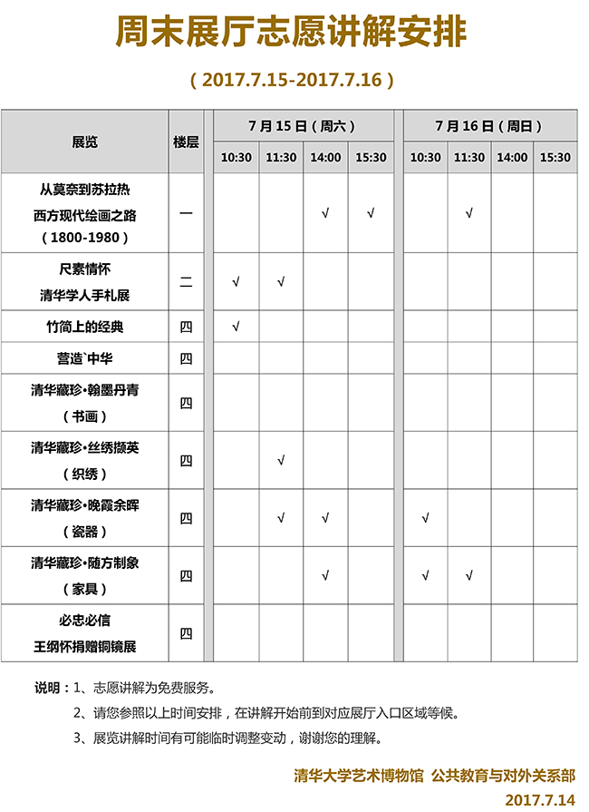 清华大学艺术博物馆 周末展厅志愿讲解安排(2017年7月15日-16日)