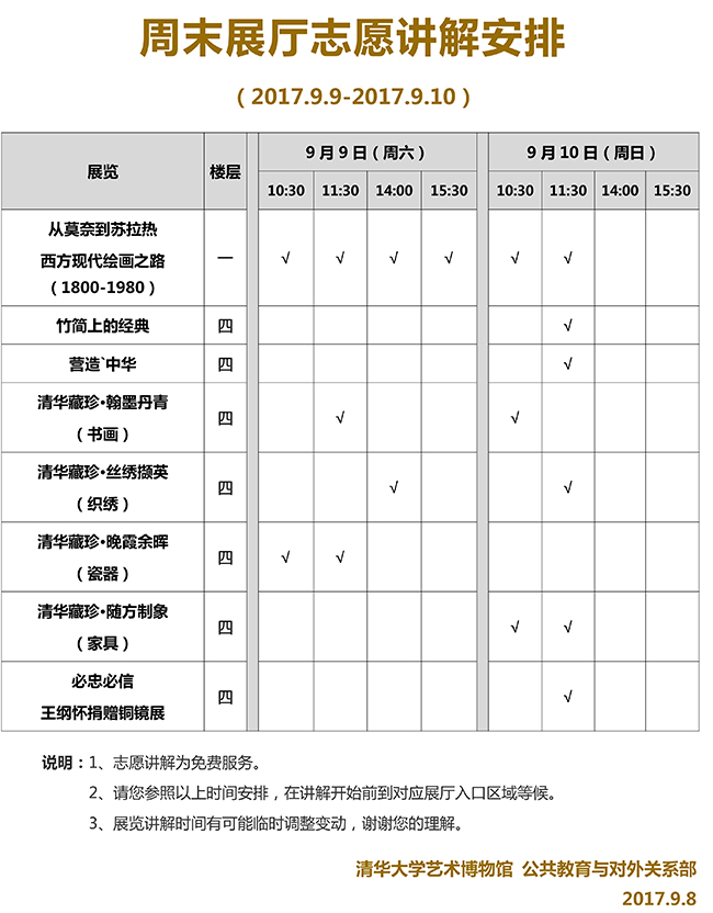 清华大学艺术博物馆 周末展厅志愿讲解安排(2017年9月9日-10日)