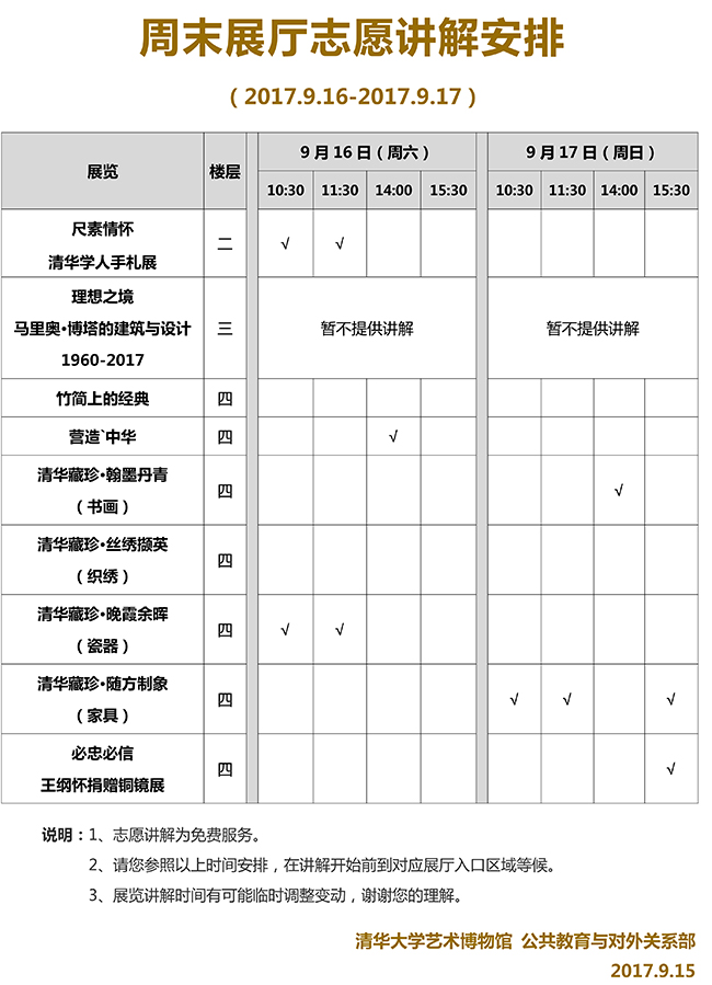 清华大学艺术博物馆 周末展厅志愿讲解安排(2017年9月16日-17日)