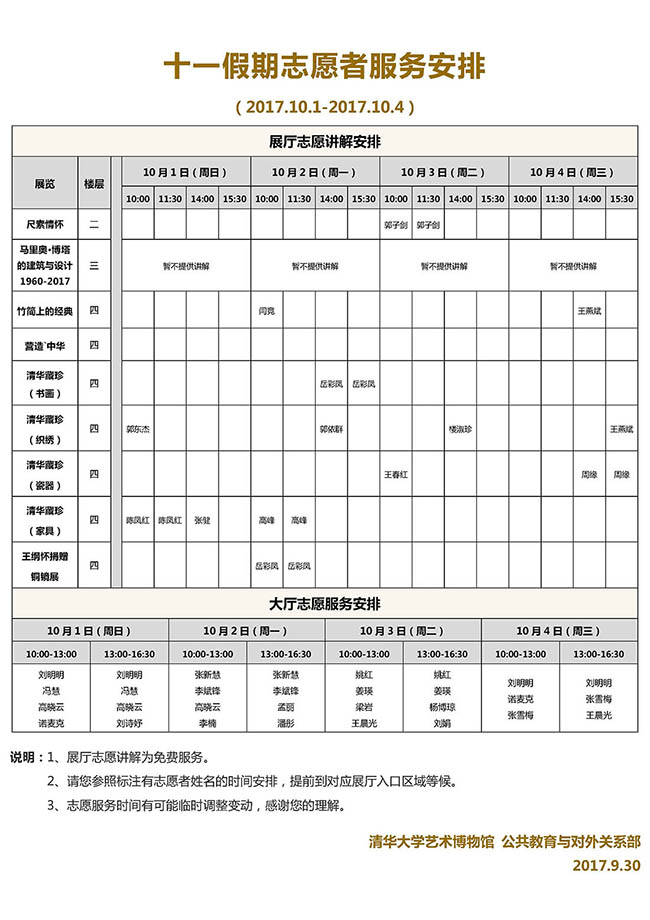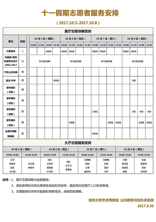 清华大学艺术博物馆 十一假期展厅志愿讲解安排(2017年10月1日-8日)