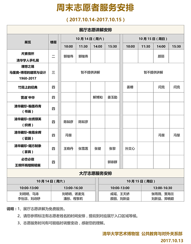 清华大学艺术博物馆 周末展厅志愿讲解安排(2017年10月14日-15日)