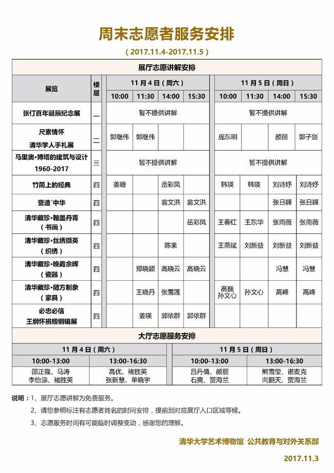 清华大学艺术博物馆 周末展厅志愿讲解安排(2017年11月4日-5日)