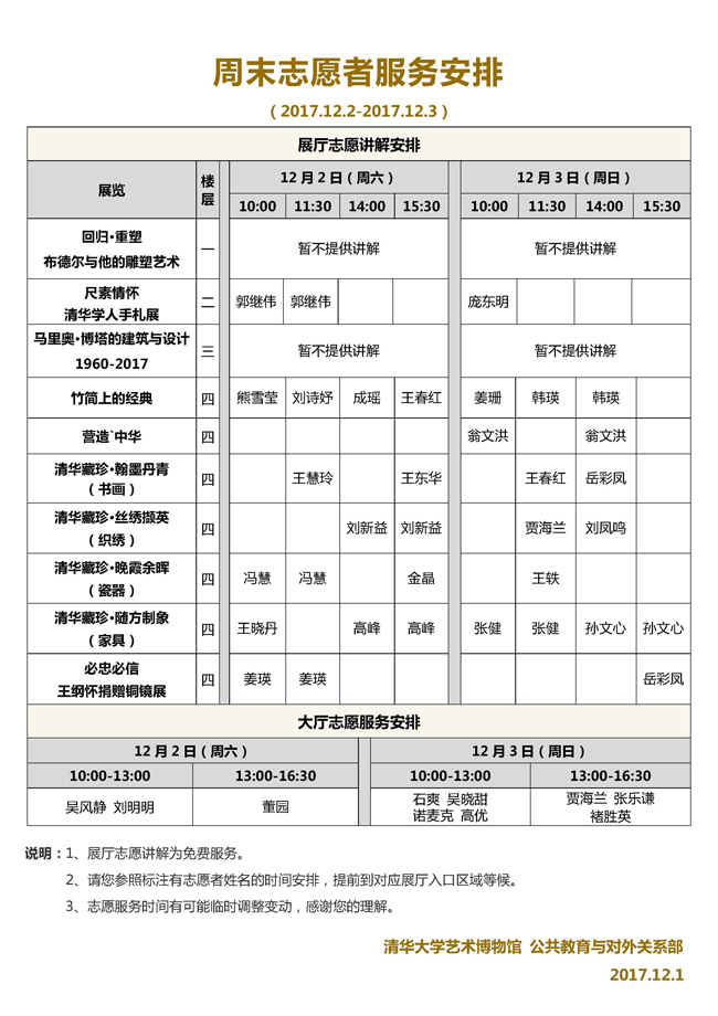 清华大学艺术博物馆 周末展厅志愿讲解安排(2017年12月2日-3日)