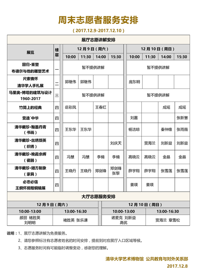 清华大学艺术博物馆 周末展厅志愿讲解安排(2017年12月9日-10日)