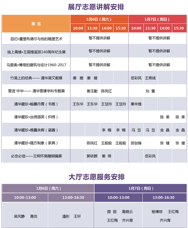 说 明: 1、展厅志愿讲解为免费服务。 2、请您提前到对应展厅入口处等候。 3、志愿服务时间有可能临时变动,感谢您的理解。