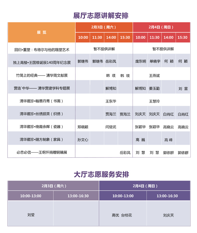 说 明: 1、展厅志愿讲解为免费服务。 2、请您提前到对应展厅入口处等候。 3、志愿服务时间有可能临时变动,感谢您的理解。