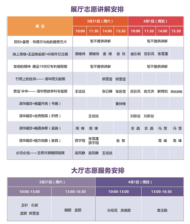 说 明: 1、展厅志愿讲解为免费服务。 2、请您提前到对应展厅入口处等候。 3、志愿服务时间有可能临时变动,感谢您的理解。