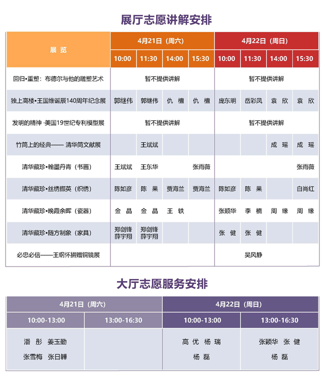 说 明: 1、展厅志愿讲解为免费服务。 2、请您提前到对应展厅入口处等候。 3、志愿服务时间有可能临时变动,感谢您的理解。