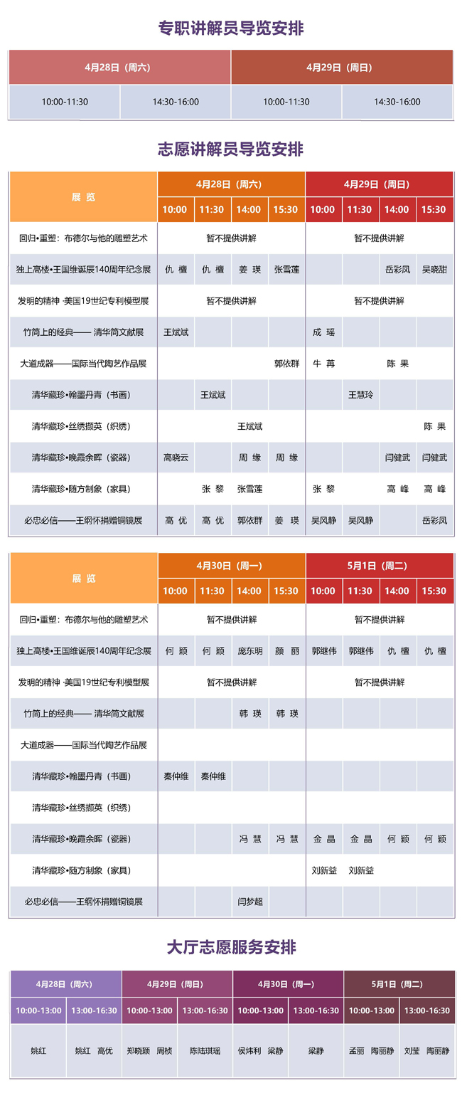 说 明: 1、专职讲解员导览为免费服务,请您提前到博物馆大厅北侧服务台等候。 2、志愿讲解员导览为免费服务,请您提前到对应展厅入口处等候。 3、志愿服务时间有可能临时变动,感谢您的理解。