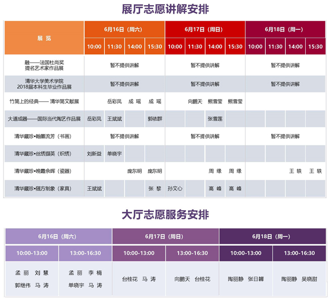 说 明: 1、展厅志愿讲解为免费服务。 2、请您提前到对应展厅入口处等候。 3、志愿服务时间有可能临时变动,感谢您的理解。