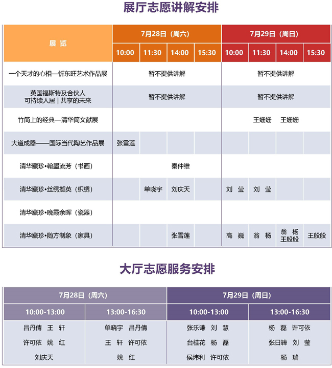 说 明: 1、展厅志愿讲解为免费服务。 2、请您提前到对应展厅入口处等候。 3、志愿服务时间有可能临时变动,感谢您的理解。