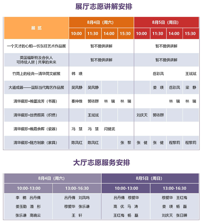 说 明: 1、展厅志愿讲解为免费服务。 2、请您提前到对应展厅入口处等候。 3、志愿服务时间有可能临时变动,感谢您的理解。