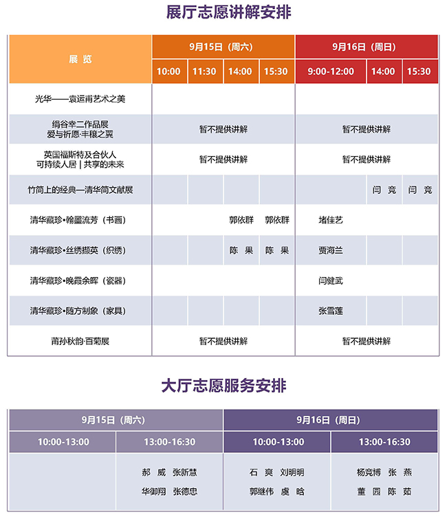 说 明: 1、展厅志愿讲解为免费服务。 2、请您提前到对应展厅入口处等候。 3、志愿服务时间有可能临时变动,感谢您的理解。