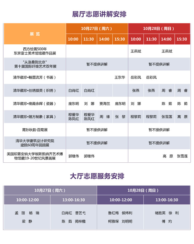 说 明: 1、展厅志愿讲解为免费服务。 2、请您提前到对应展厅入口处等候。 3、志愿服务时间有可能临时变动,感谢您的理解。