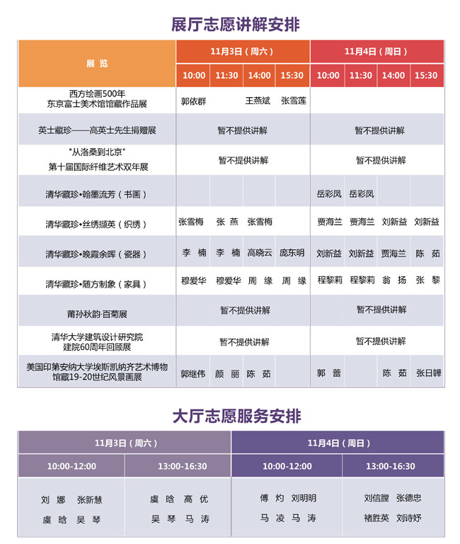 说 明: 1、展厅志愿讲解为免费服务。 2、请您提前到对应展厅入口处等候。 3、志愿服务时间有可能临时变动,感谢您的理解。