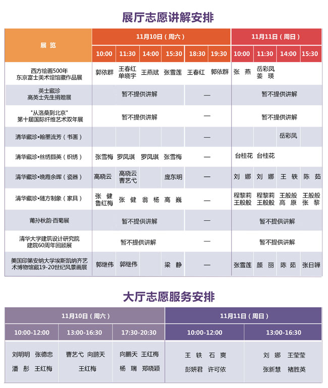 说 明: 1、展厅志愿讲解为免费服务。 2、请您提前到对应展厅入口处等候。 3、志愿服务时间有可能临时变动,感谢您的理解。