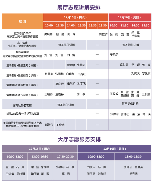 说 明: 1、展厅志愿讲解为免费服务。 2、请您提前到对应展厅入口处等候。 3、志愿服务时间有可能临时变动,感谢您的理解。