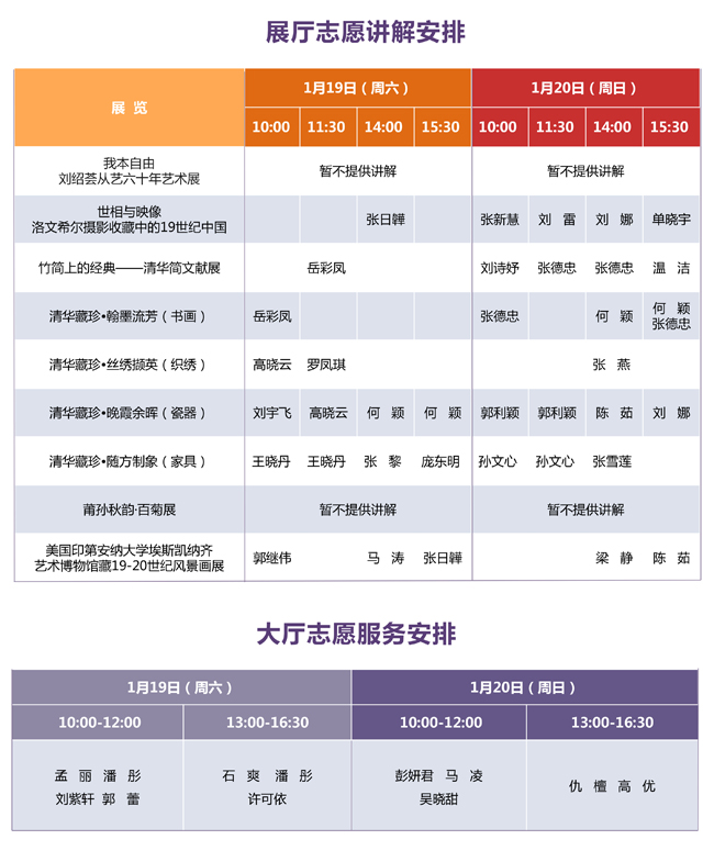 说 明: 1、展厅志愿讲解为免费服务。 2、请您提前到对应展厅入口处等候。 3、志愿服务时间有可能临时变动,感谢您的理解。