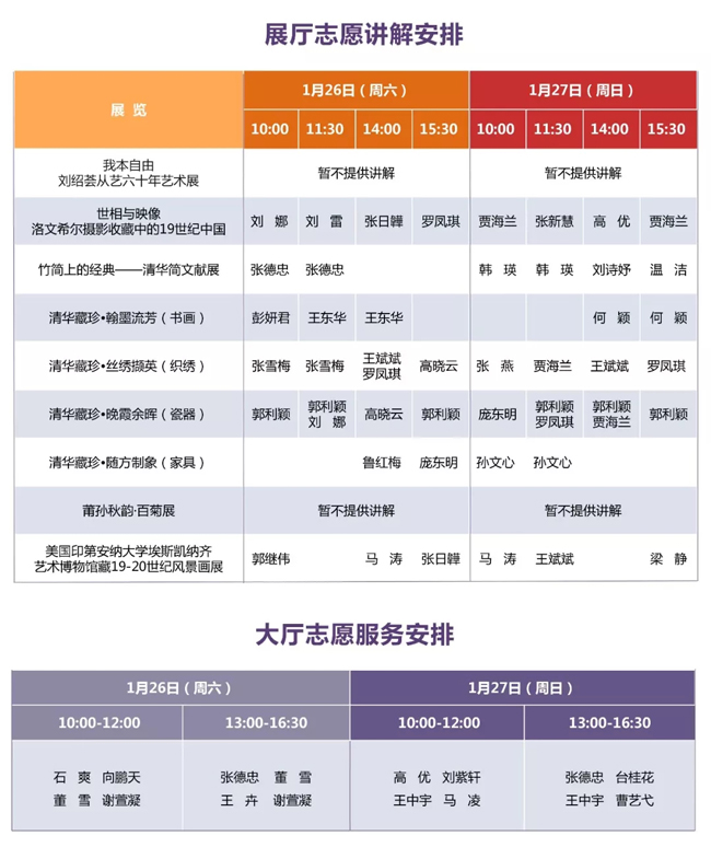 说 明: 1、展厅志愿讲解为免费服务。 2、请您提前到对应展厅入口处等候。 3、志愿服务时间有可能临时变动,感谢您的理解。