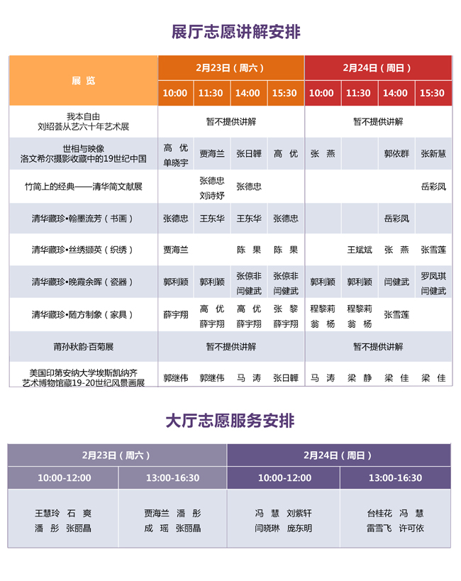 说 明: 1、展厅志愿讲解为免费服务。 2、请您提前到对应展厅入口处等候。 3、志愿服务时间有可能临时变动,感谢您的理解。