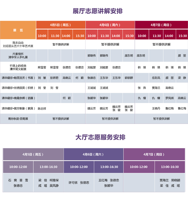 说 明: 1、展厅志愿讲解为免费服务。 2、请您提前到对应展厅入口处等候。 3、志愿服务时间有可能临时变动,感谢您的理解。