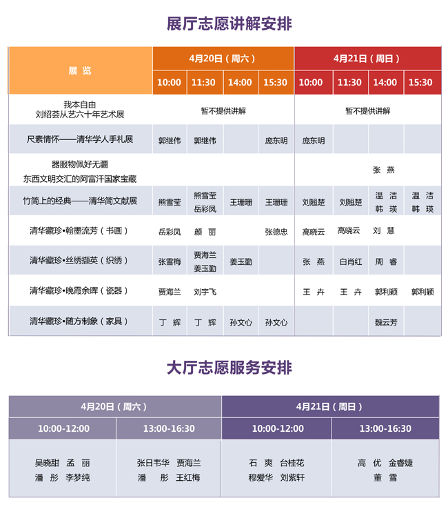 说 明: 1、展厅志愿讲解为免费服务。 2、请您提前到对应展厅入口处等候。 3、志愿服务时间有可能临时变动,感谢您的理解。