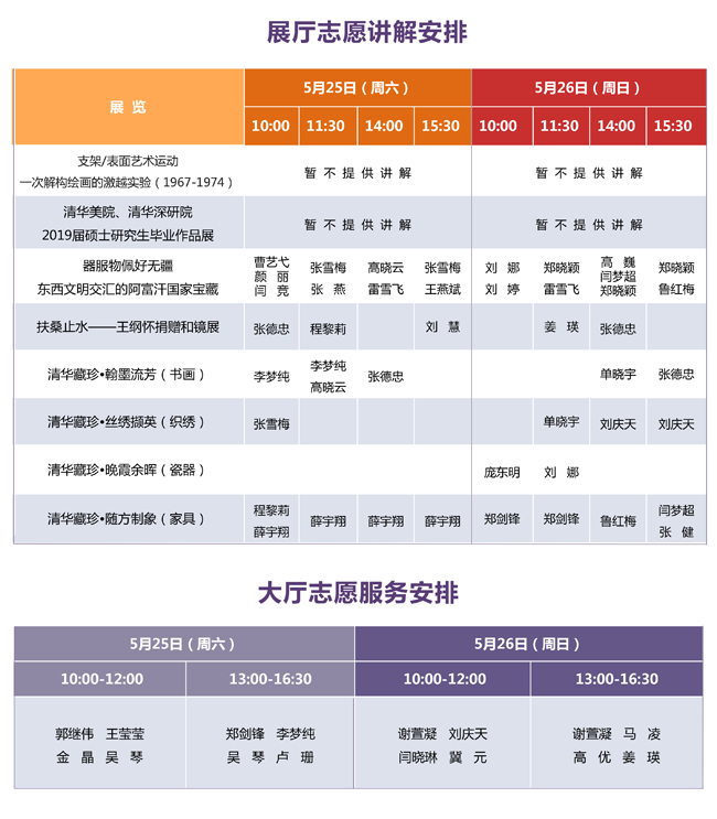 说 明: 1、展厅志愿讲解为免费服务。 2、请您提前到对应展厅入口处等候。 3、志愿服务时间有可能临时变动,感谢您的理解。