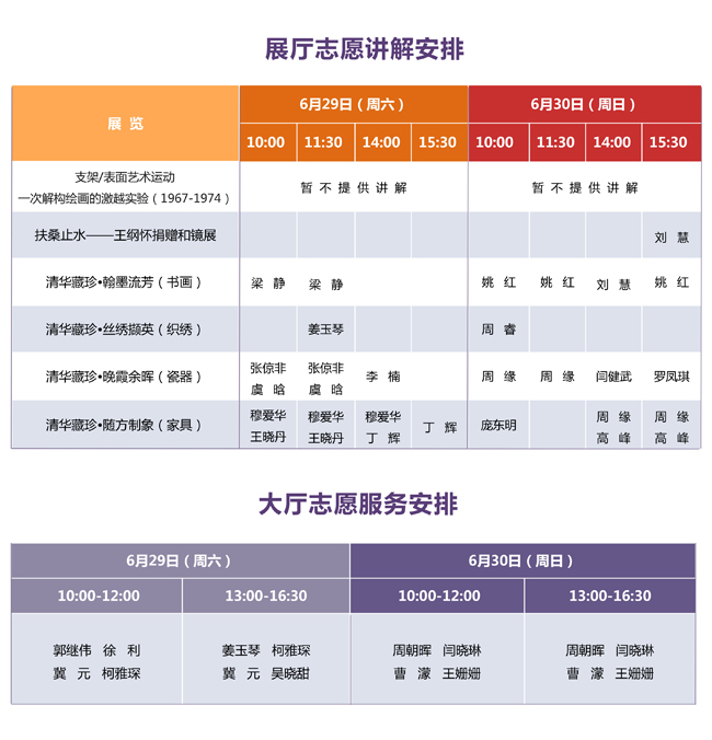 说 明: 1、展厅志愿讲解为免费服务。 2、请您提前到对应展厅入口处等候。 3、志愿服务时间有可能临时变动,感谢您的理解。