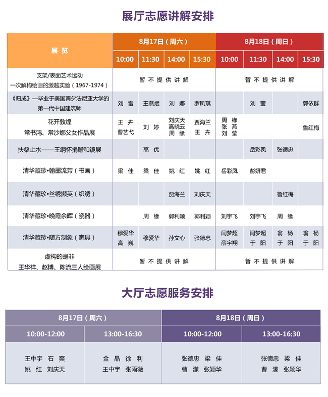说 明: 1、展厅志愿讲解为免费服务。 2、请您提前到对应展厅入口处等候。 3、志愿服务时间有可能临时变动,感谢您的理解。