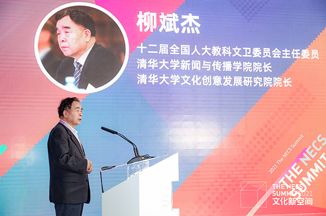 十二届全国人大教科文卫委员会主任委员、清华大学新闻与传播学院院长、清华大学文化创意发展研究院院长柳斌杰发表主题演讲